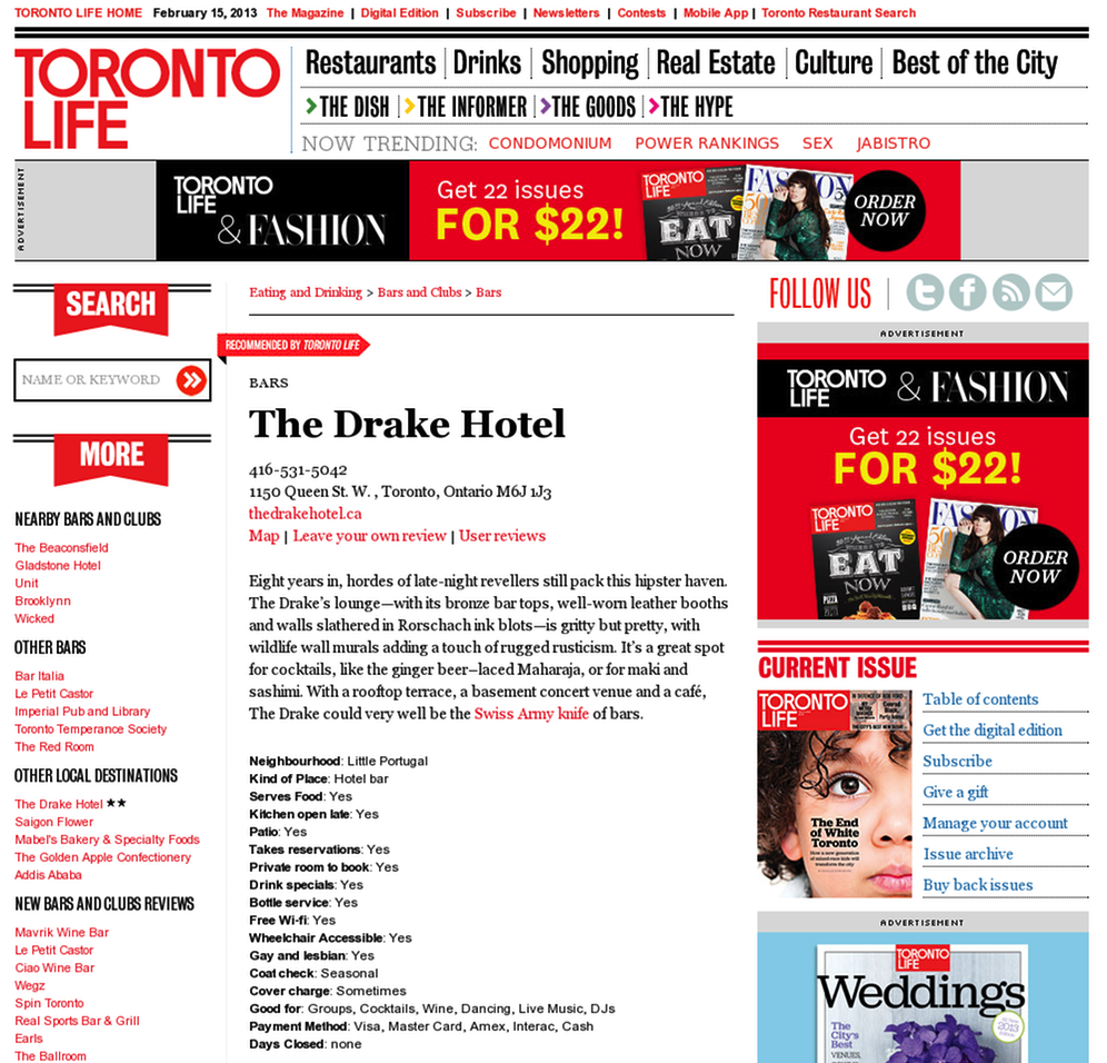 The Toronto Life online eating and drinking guide consists of more than 1,500 restaurant, food shop, and bars & clubs listings. As the listings database editor, I helped relaunch three databases, as well as coordinated the expansion of the online restaurant guide, increasing the initial 400 business listings to just over 1,000.
